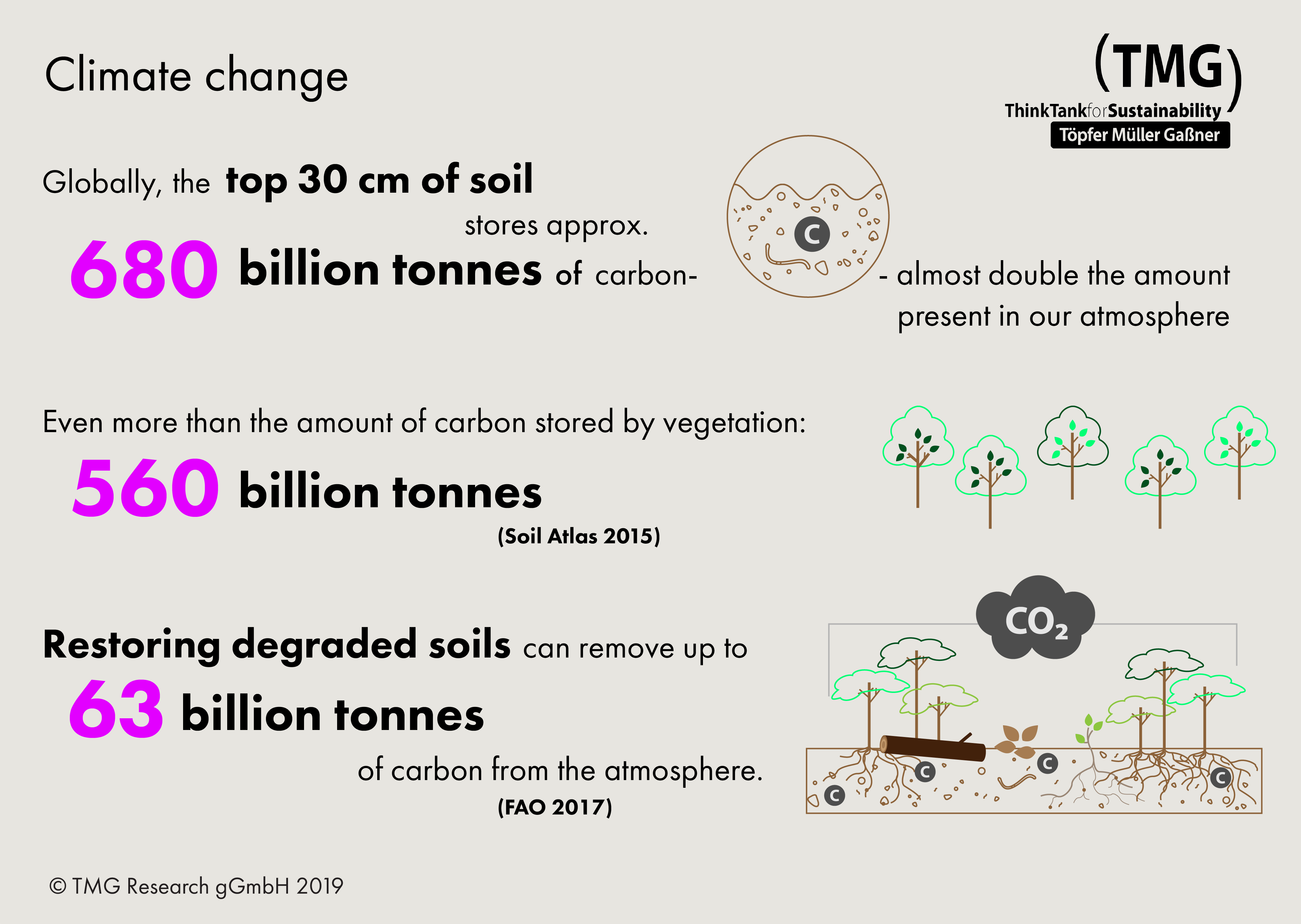 Globally, the top 30 cm of soil stores approx. 680 billion tonnes of carbon. Even more than the amount of carbon stored by vegetation: 560 billion tonnes. Restoring degraded soils can remove up to 63 billion tonnes of carbon from the atmosphere.