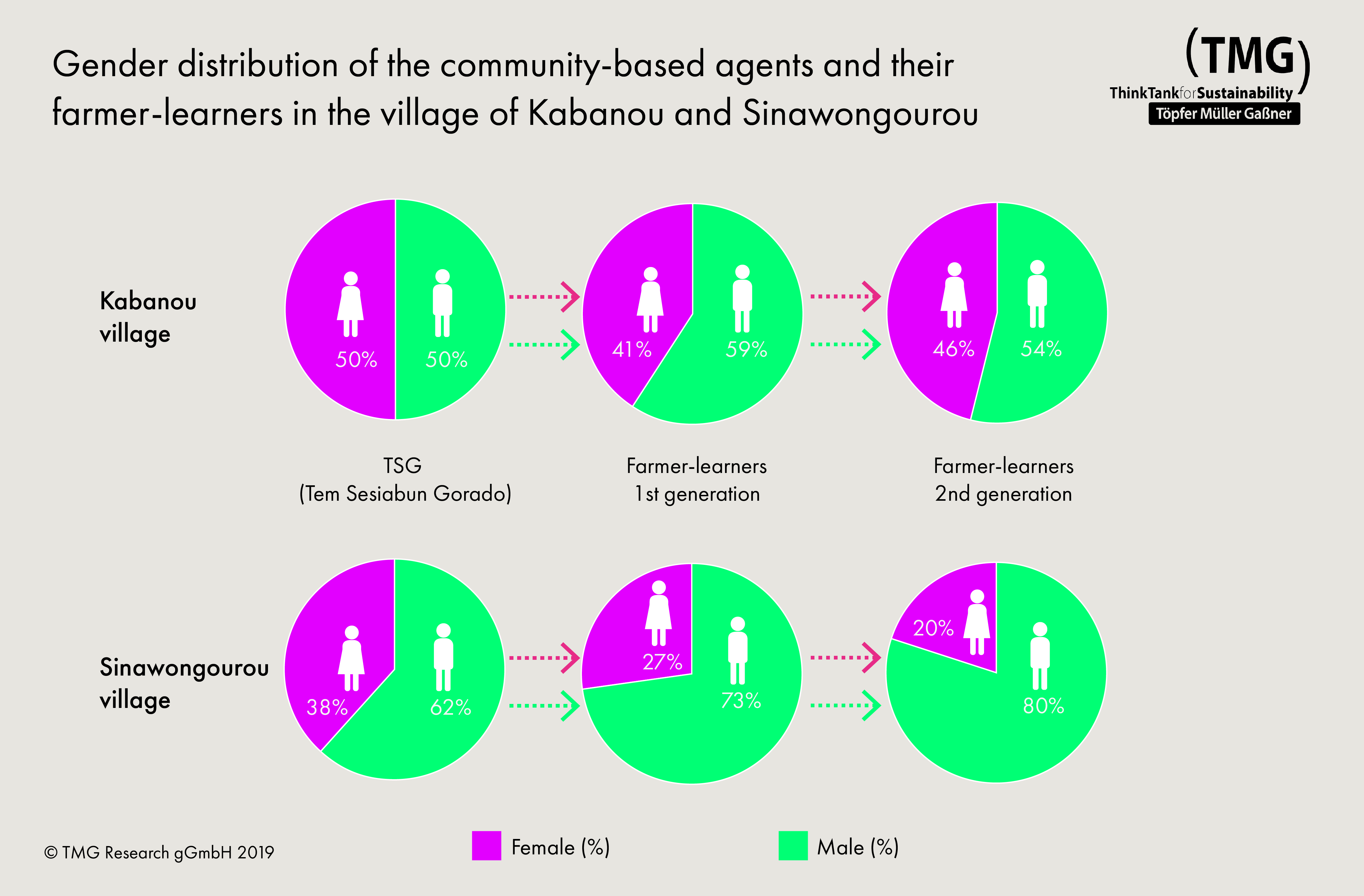 Gender distribution of the community-based agents and their farmer-learners in the village of Kabanou and Sinawongourou