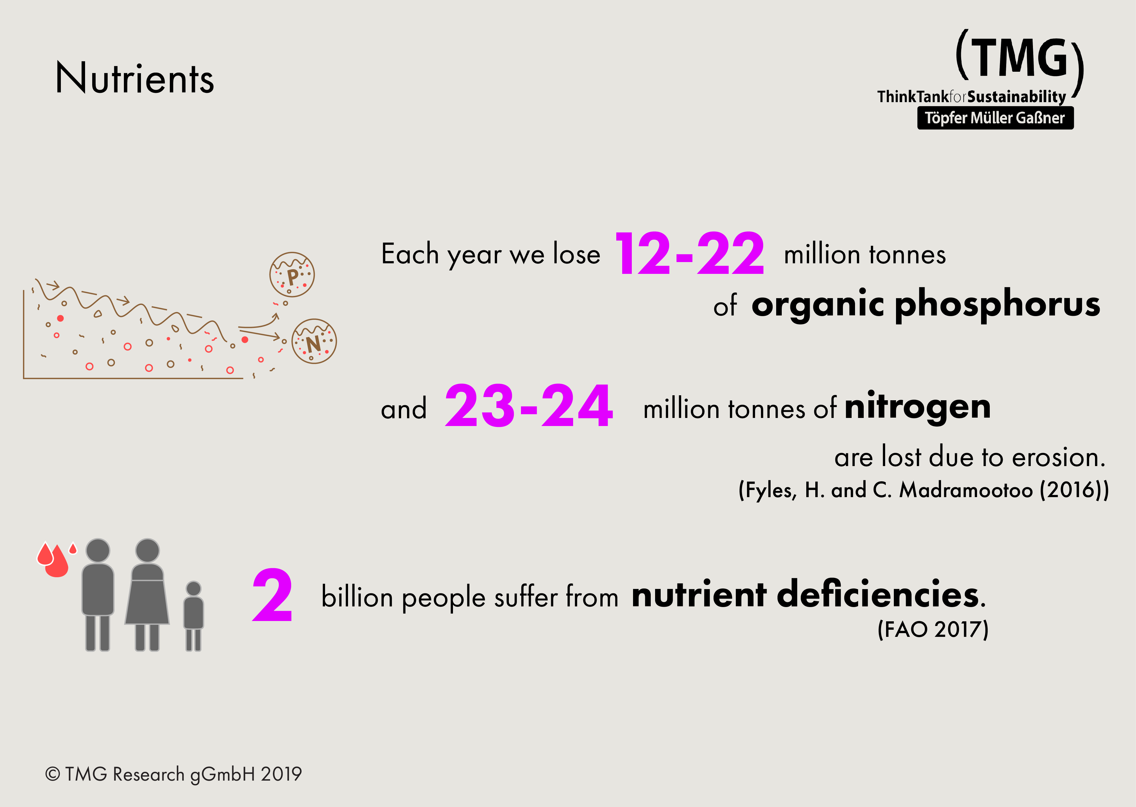 Each year we lose 12–22 million tonnes of organic phosphorus and 23–24 million tonnes of nitrogen are lost due to erosion. 2 billion people suffer from nutrient deficiencies.