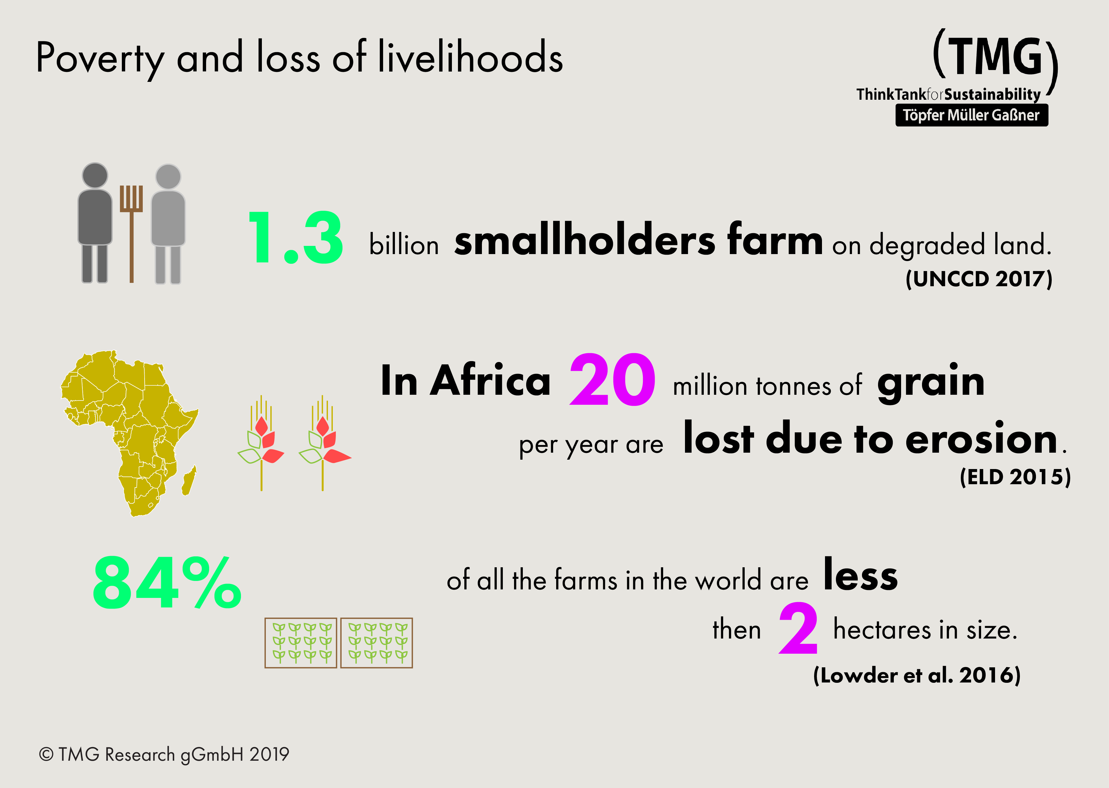 1.3 billion smallholders farm on degraded land. In Africa, 20 million tonnes of grain per year are lost due to erosion. 84% of all farms in the world are less than 2 hectares in size.